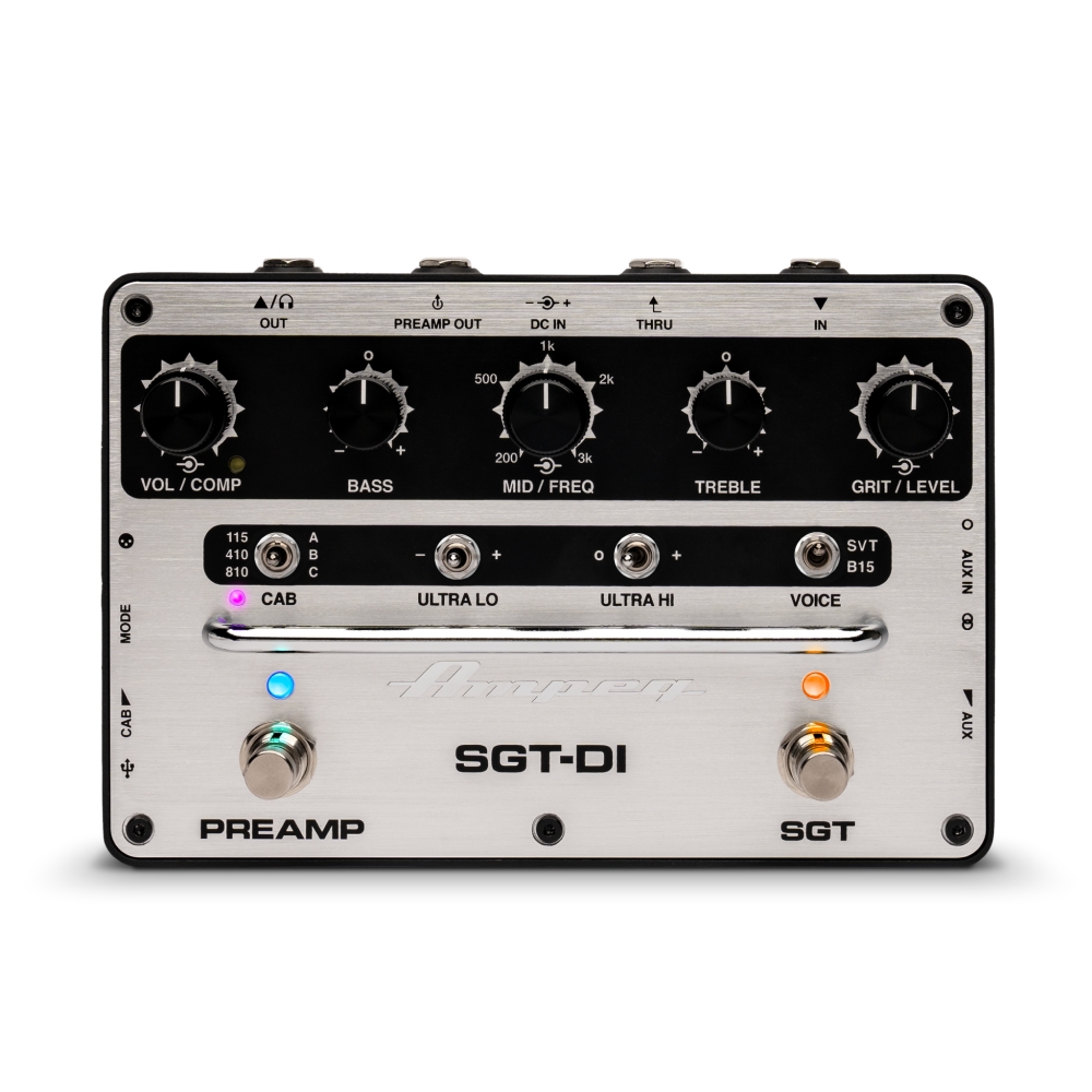 The SGT-DI preamp and DI gives modern bassists an entire rig in a single stompbox. It delivers an enhanced Super Grit Technology overdrive circuit featuring iconic Ampeg SVT and B15 voices, versatile 3-band EQ now with sweepable mids, Ultra-Hi and 3-way Ultra-Lo switches, a variable compressor, and an Aux /Headphone section.