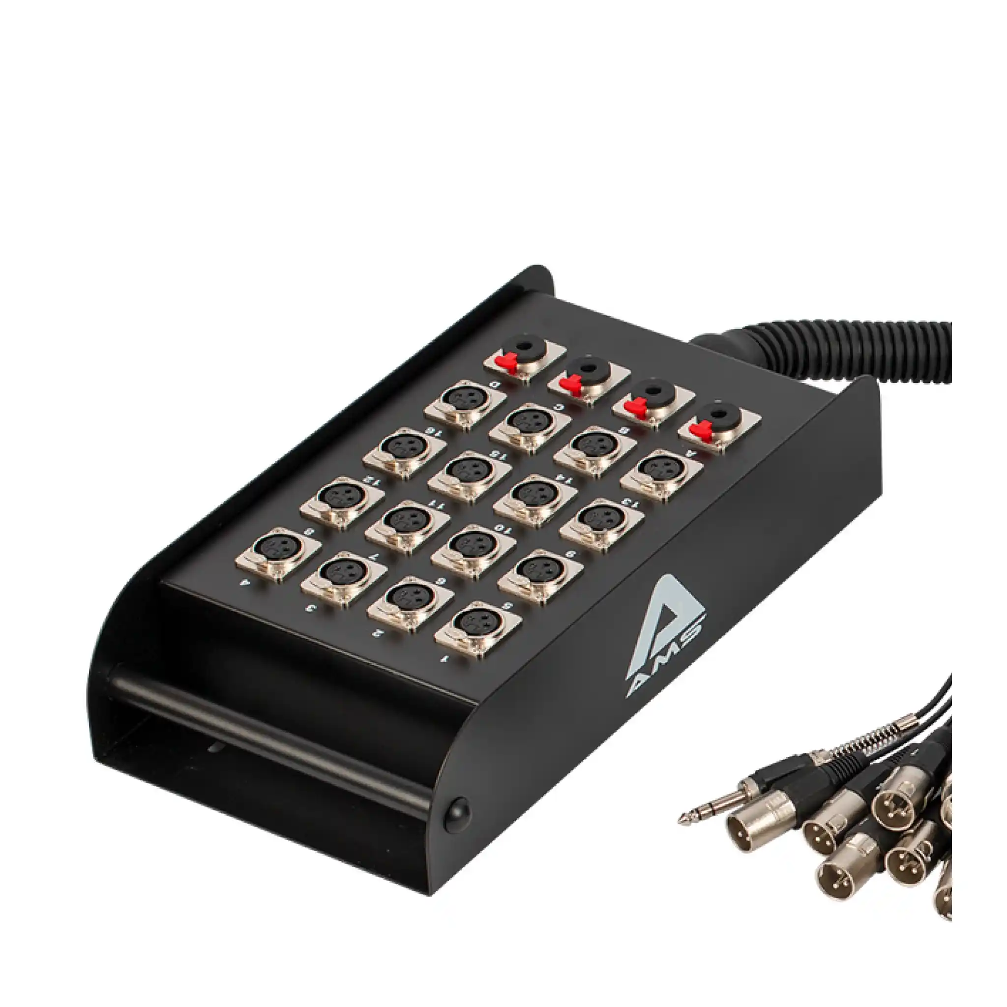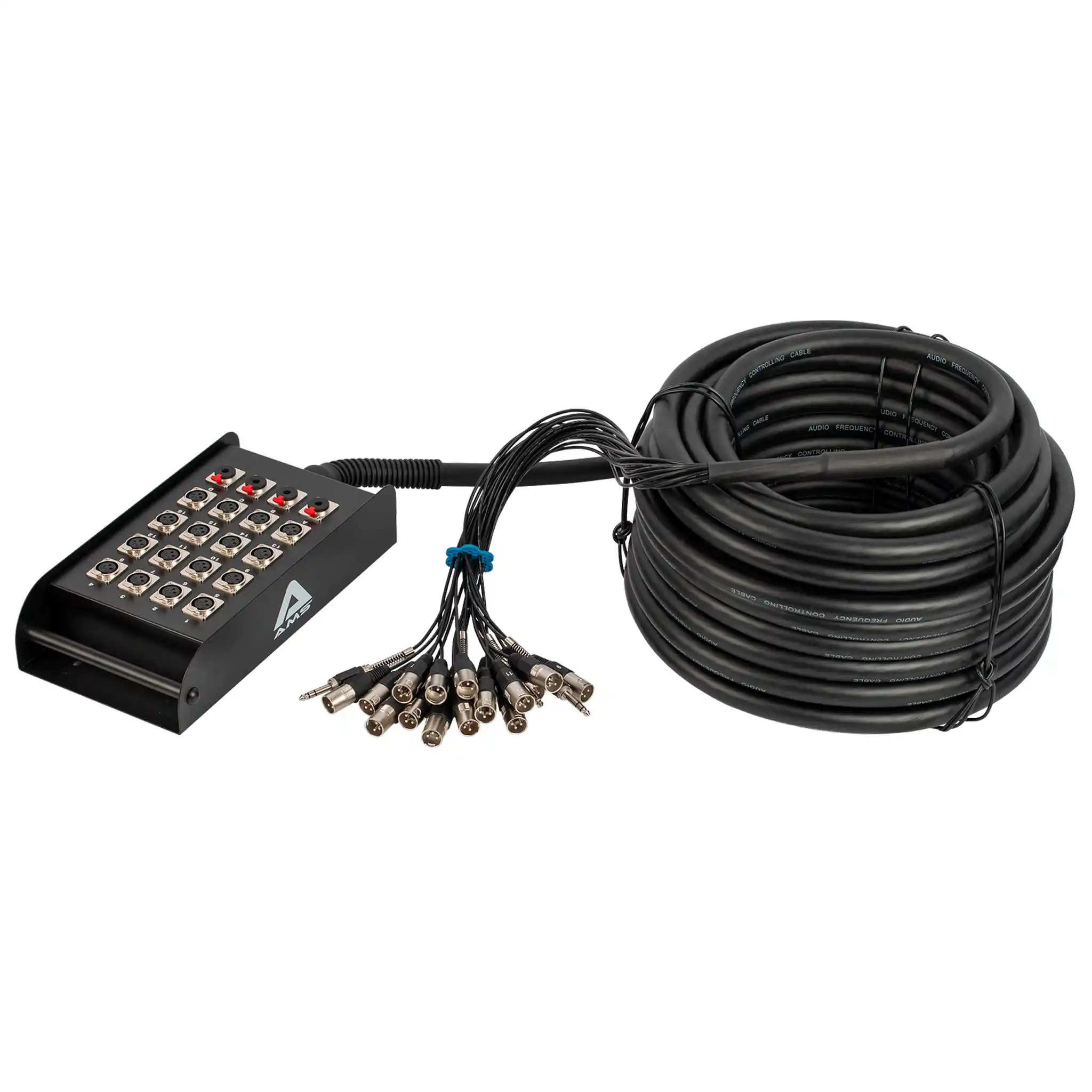 The AMS 20-channel multicore features a durable all-steel stagebox with wall-mounting holes and a sturdy steel handle. It includes 16 locking XLR female inputs and 4 locking 6.3mm balanced jack inputs for instruments or send/returns. Built with high-quality shielded cables in a tough, flexible casing, each connector is clearly numbered for quick and easy setup. Weighs 21kg. Length: 30 metres.