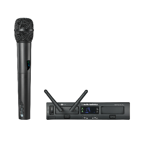 - ATW-RC13 Rack-mount receiver chassis, ATW-RU13 receiver unit and ATW-T1002 handheld dynamic unidirectional microphone/transmitter.