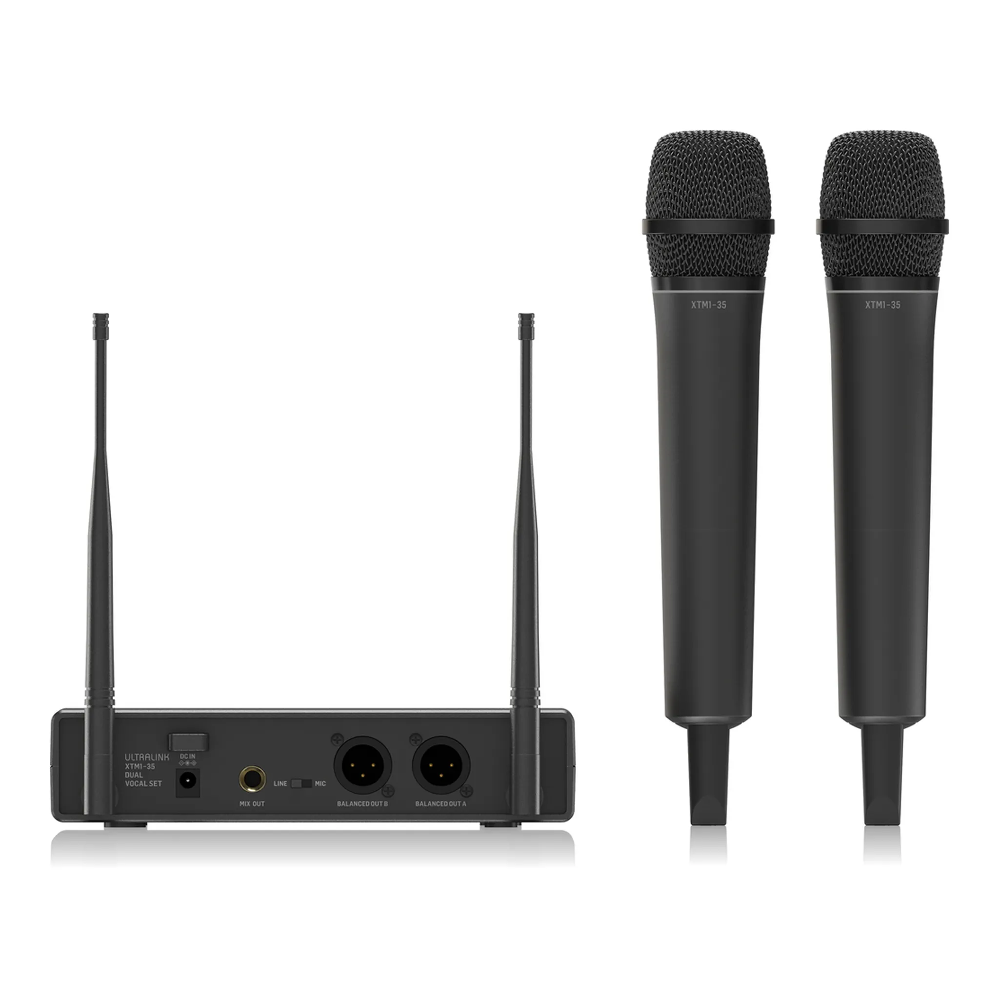 The Behringer XTM1‑35 Dual Vocal Set is a high-performance two-person UHF wireless microphone system, designed for broadcasters, presenters, singers, musicians, actors, and performers of all types. Featuring an antenna diversity receiver, dual-channel controls, and high-quality dynamic vocal capsules, it ensures clear, natural sound with minimal interference.