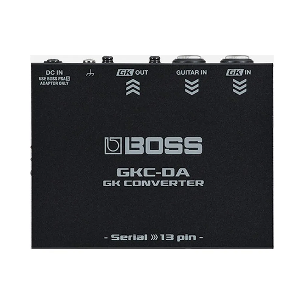 The latest BOSS guitar synthesizer products feature the Serial GK digital interface, a newly developed connection method that delivers evolved performance over the analog 13-pin GK interface used in earlier BOSS and Roland guitar synth and modeling products. The GKC-DA GK Converter allows you to drive a 13-pin GK device such as the BOSS SY-1000 or GP-10 using the Serial GK output on a GK-5 or GK-5B Divided Pickup or the GM-800 Guitar Synthesizer.