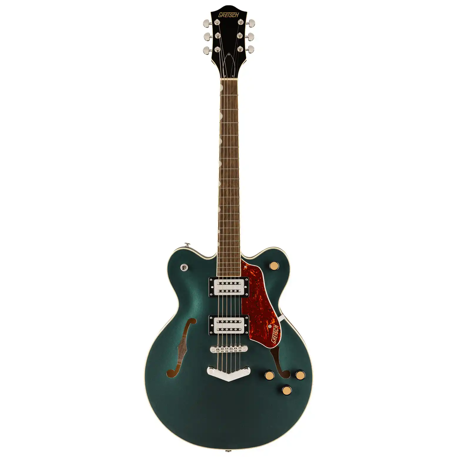 A traditional Gretsch control layout is enhanced with a push/pull coil split on the master volume, unlocking single-coil tones for added versatility. Finished in Cadillac Green with nickel hardware, radio knobs, and a Gretsch V-Stoptail, this guitar blends classic looks with modern performance.