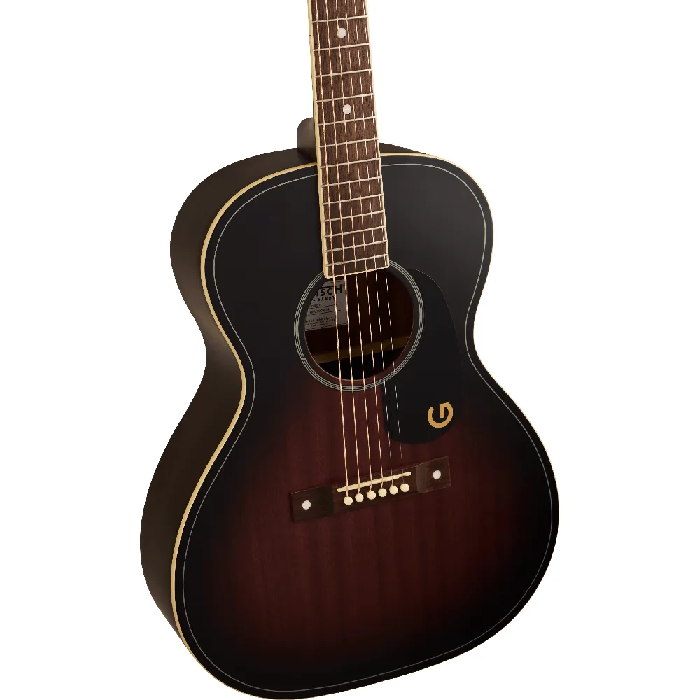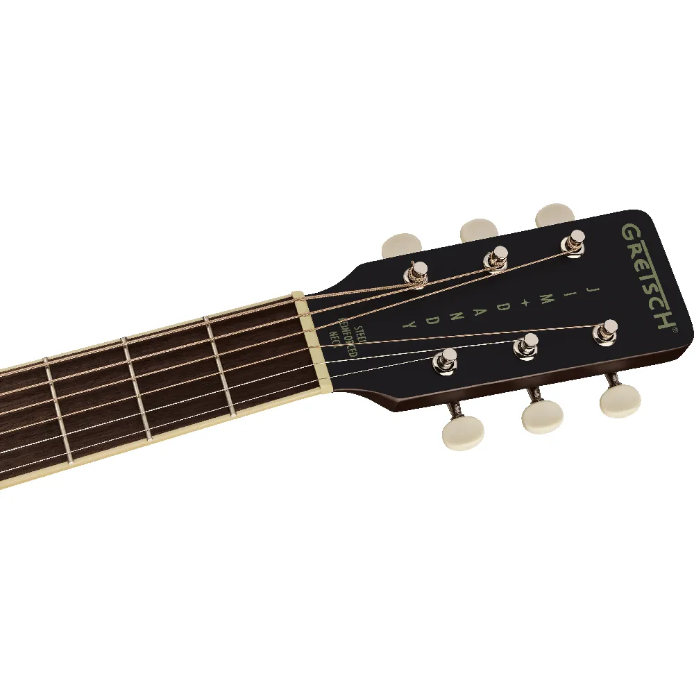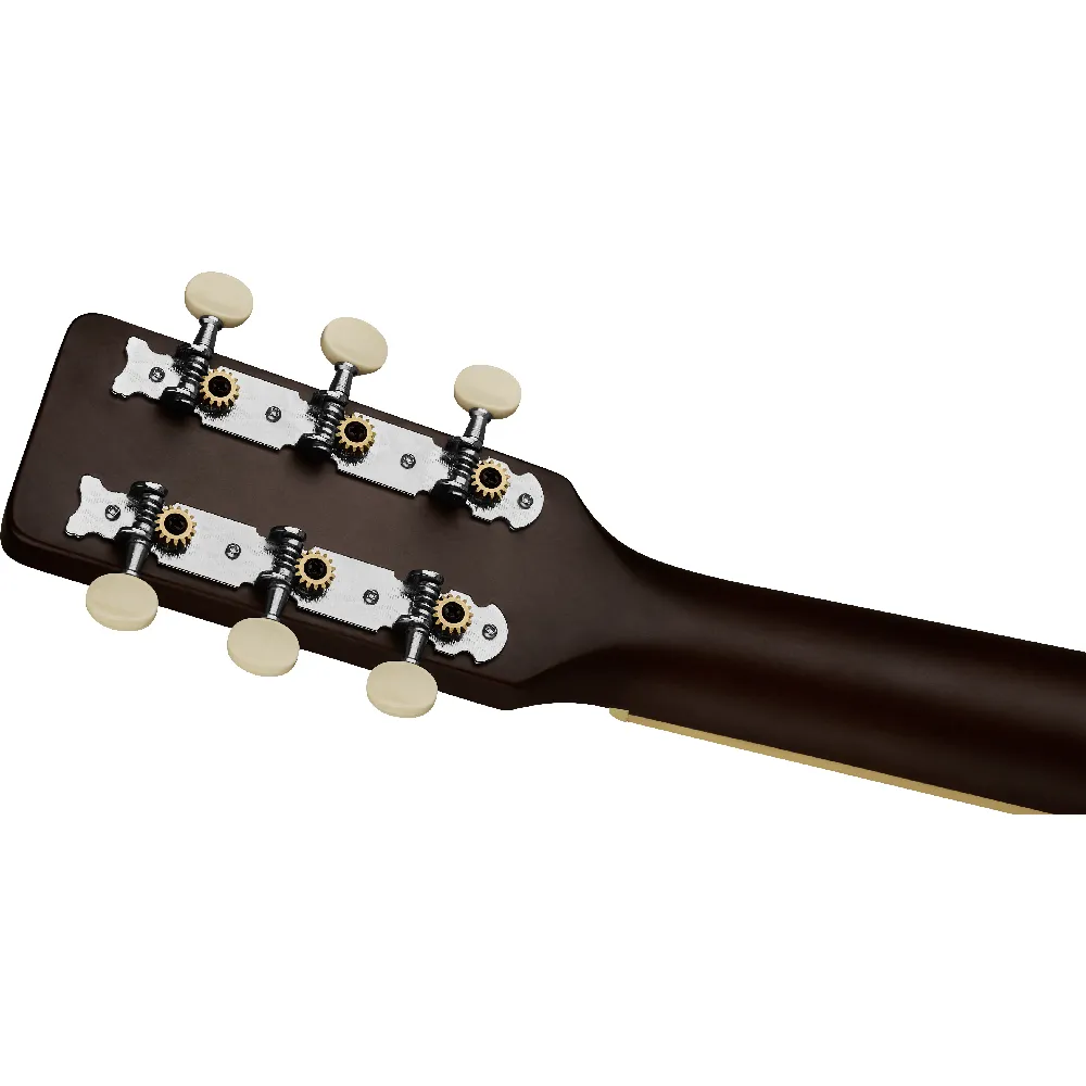The X-braced body is crafted with select lightweight laminate tonewoods for an optimal balance of woody vintage tone and reliable durability, while the âCâ-shape neck presents an inviting feel for hours of old-timey inspiration. Period-correct details such as a vintage-style pinned bridge, âGâ-graphic pickguard, painted pinstripe purfling, 3-on-a-plate open-gear tuning machines and oversized dot fingerboard inlays combine for a nostalgic personality destined for any barnburner or jamboree.