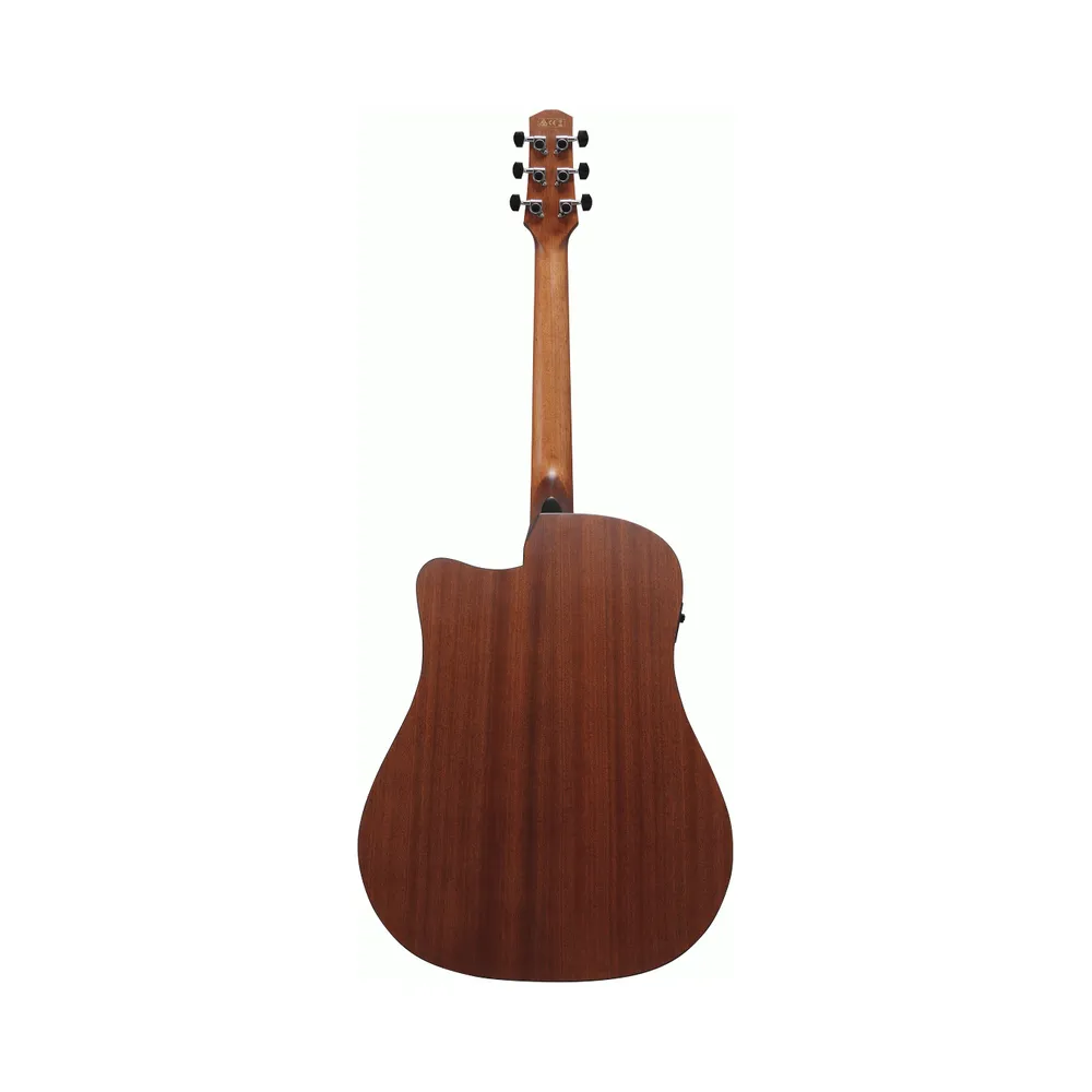 – Grand Dreadnought bodyThrough a rigorous R&D process spanning several years, Ibanez has reimagined the Dreadnought from the ground up, pursuing the height of rich sound, robust low end, and rich tone. This brand new body shape is called the Grand Dreadnought. Proportionally, the Grand Dreadnought body is 5% larger than a standard dreadnought, allowing for more volume, richer tone, and more powerful low end response. Itās also extremely comfortable to play thanks to the extensive consideration given to its ergonomics