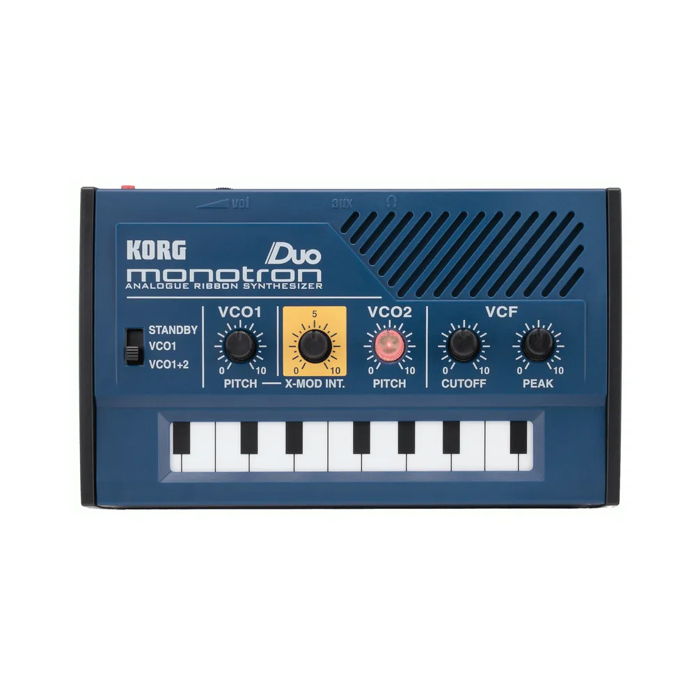 The Dual Oscillator monotron DUO offers X-MOD capabilities for generating even more extreme sounds.Go Anywhere Analog: That was the theme behind the remarkable battery-powered and palm-sized analog synthesizer that Korg dubbed the monotron. Now the powerful and fun-to-play monotron is joined by two new siblings. Each is played from a ribbon controller keyboard with newly added features. The monotron's simple operation and ease of use (5 knobs and 1 switch) is alive and well, inviting hours of enjoyment and musical exploration.