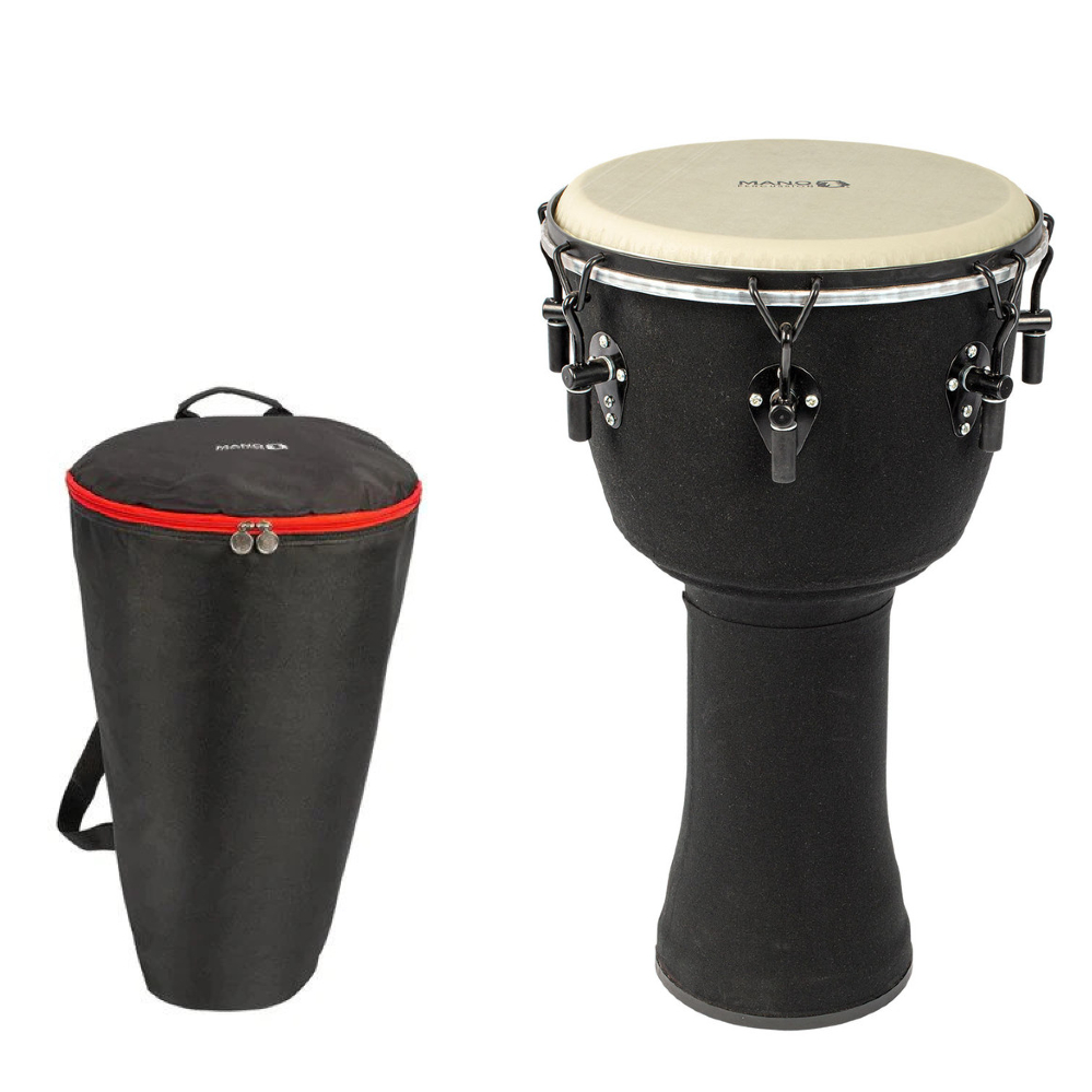 Mano percussion – 12″ wrench tunable djembe. ABS shell. 23 3/4″ high. 6 tunable hook lugs. Lightweight cloth wrapped shell. Rubber base strip for extra protection. Includes bag with backpack straps and tuning wrench. Black cloth.