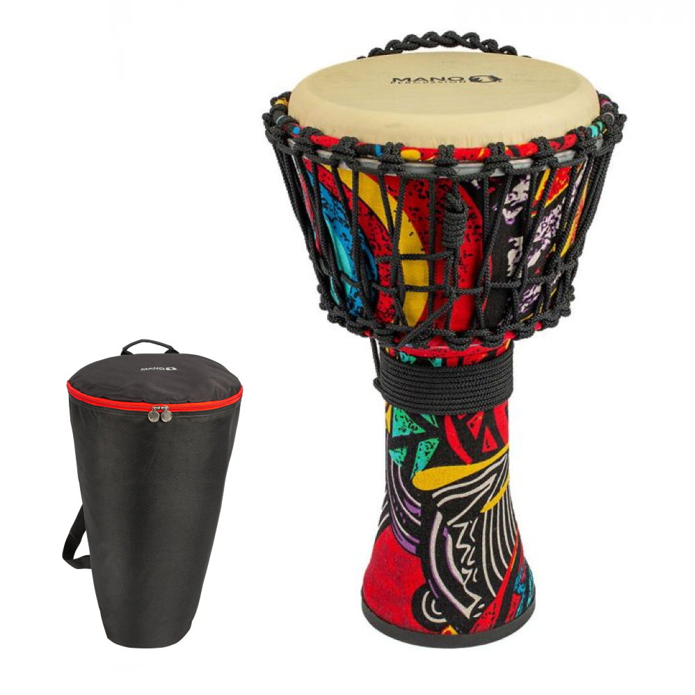 Rope tunable djembe. Lightweight cloth wrapped ABS shell. Rubber base strip for extra protection. Includes bag with backpack straps. Rope handle.