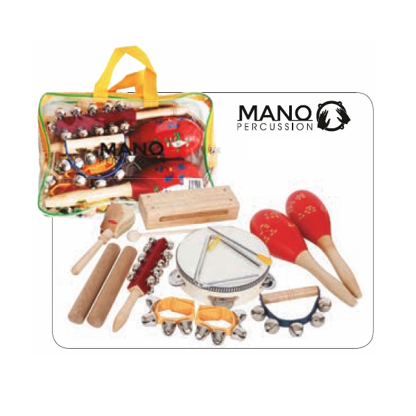 9 piece set in clear vinyl carry bag. Includes: 6″ wooden tambourine with head, wooden handle castanet, 5 bell hand bell, 21 bell hand bell, 4½” triangle with beater, 7″ wood block with beater and 1 pair each 7½” claves, 10″ wooden maracas and wrist bells.