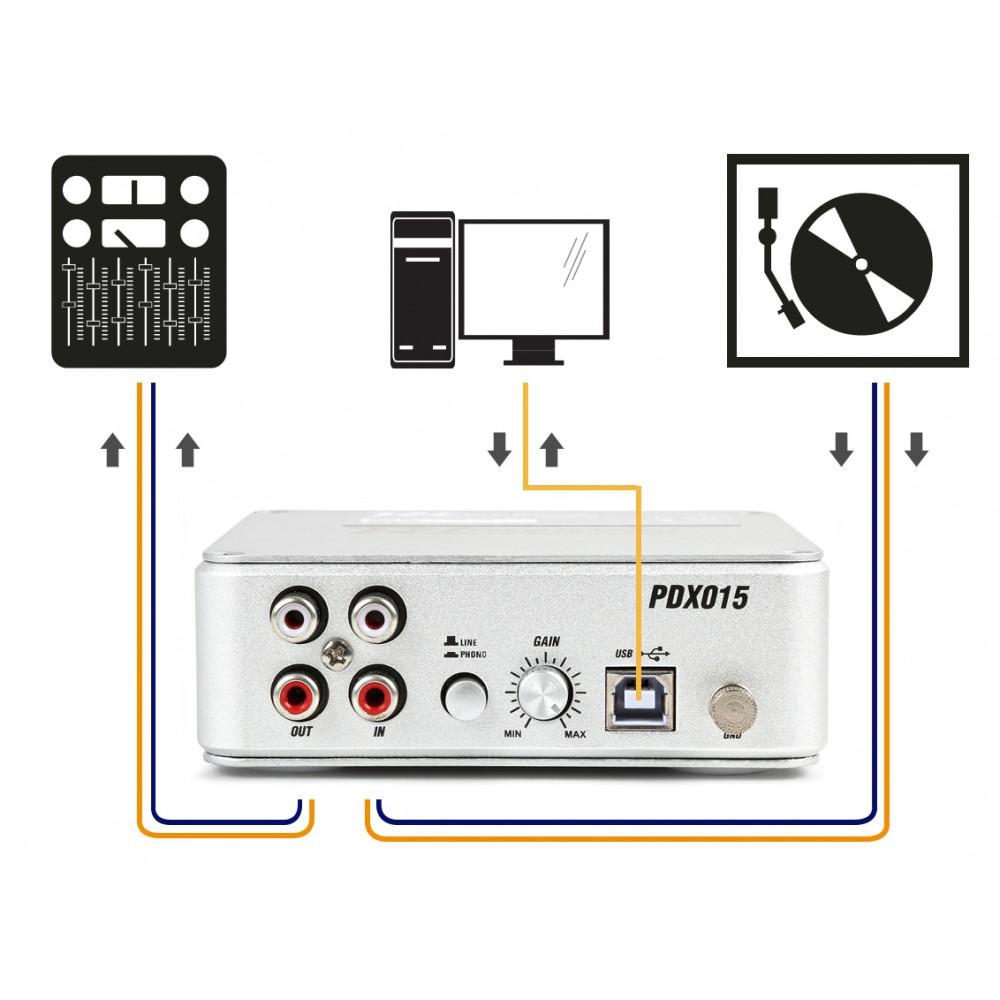 The PDX015 USB phono pre-amplifier is a high quality USB phone-/line pre-amplifier. It’s the ideal equalizer for MM-systems with many special features such as the possibility of a record player to be able to operate via USB to a PC as well as via line out to an amplifier without phono input with the supplied software. The PDX015 USB phono pre-amplifier can be powered by USB. The PDX015 USB phono pre-amplifier comes with the recording software Audacity.
