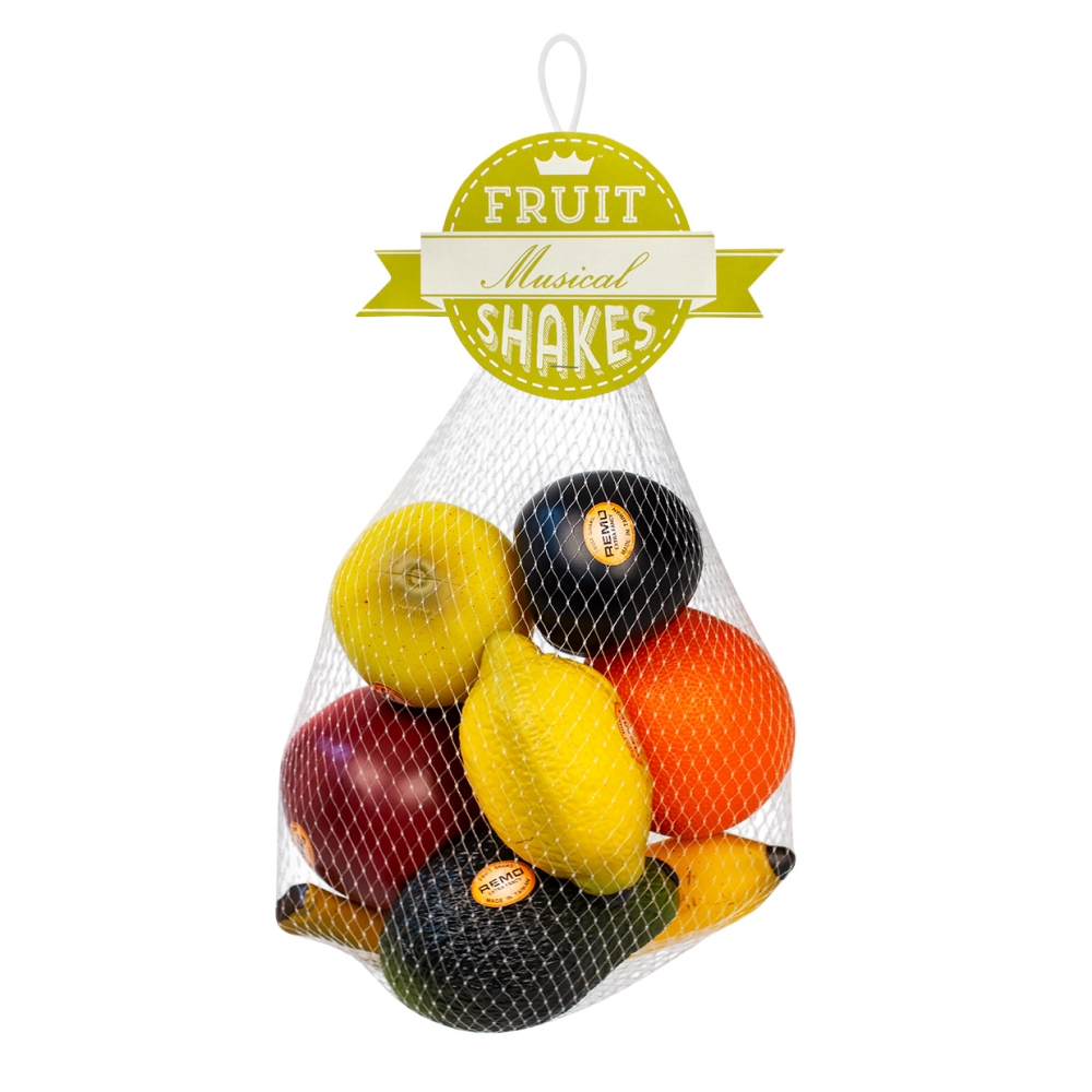 One each of: apple, avocado, banana, lemon, orange, pear and plum fruit shakers in plastic netting display bag with colour header card.