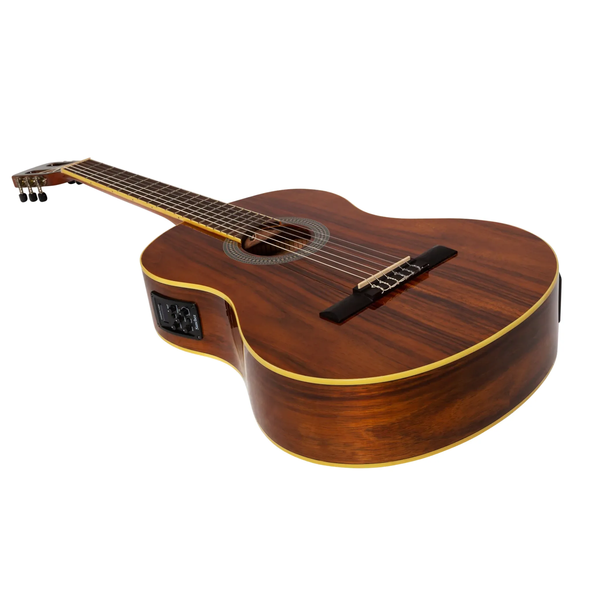 A value-packed full size classical acoustic-electric featuring laminate rosewood top, back and sides, mahogany neck with adjustable truss rod, and Sanchez K2T pickup with built-in tuner.