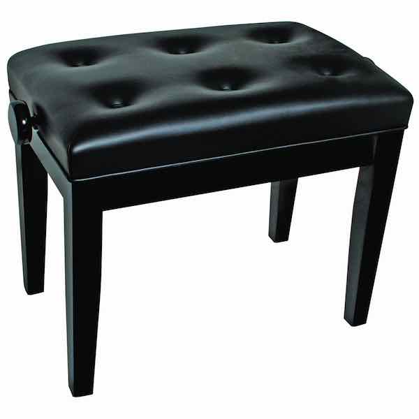 Piano stool. Height adjustable wooden bench with buttoned black vinyl padded seat. Worm drive with wooden twist knobs. Straight legs. Polished ebony. 55.5cm (W) x 33.5cm (D) x 47-57cm (H).