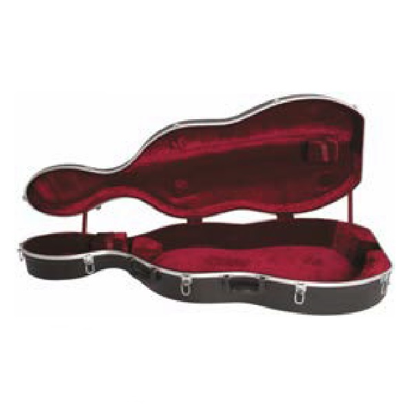 1/2 – 1/4 cello case. ABS cello case on wheels. Black moulded shaped case with aluminium valance. Plush lined interior. 2 bow holders. Chrome drawbolt latches. 2 moulded carry handles and 1 heavy duty recessed metal handle for easy pull along transportation. Chrome metal anchor points for shoulder straps.